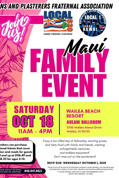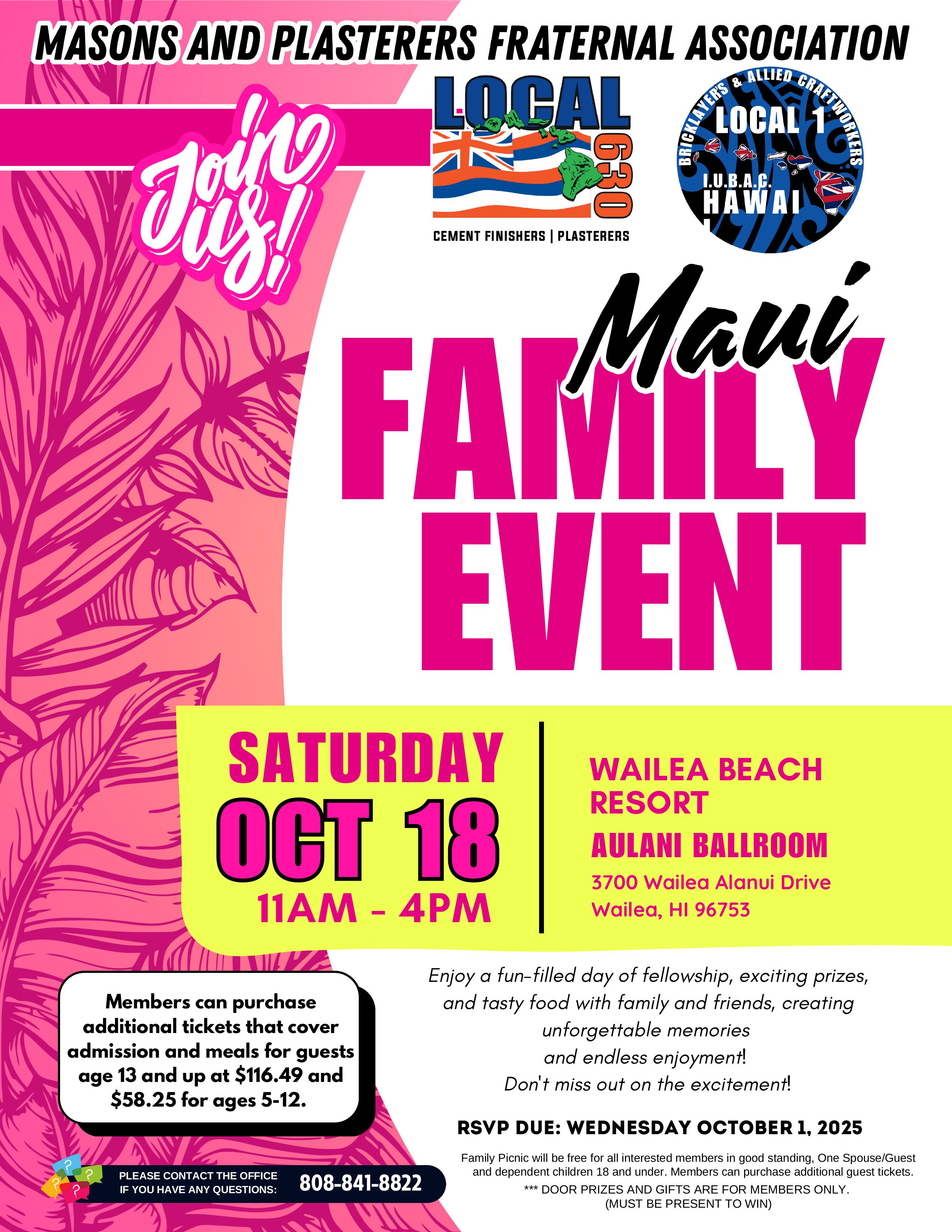 Calendar Maui Family Event October 18, 2025 11:00AM - 4:00PM Wailea Beach Resort - Aulani Ballroom Social share icons